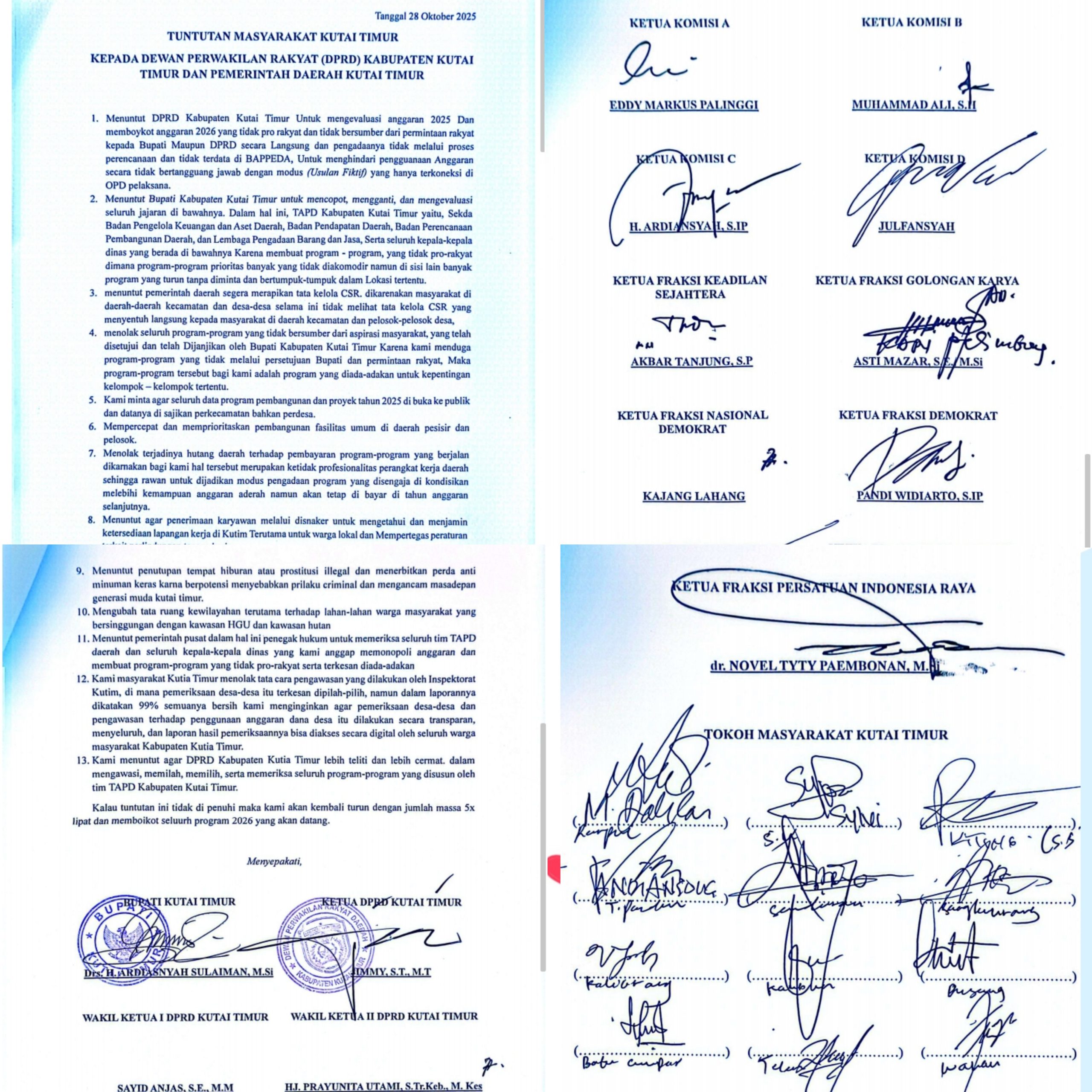 Di akhir aksi, dokumen tuntutan ditandatangani oleh Bupati Ardiansyah Sulaiman, Ketua DPRD Jimmi, serta sejumlah ketua komisi dan fraksi DPRD Kutim, antara lain Eddy Markus Palinggi (Komisi A), Muhammad Ali (Komisi B), H. Ardiansyah (Komisi C), Julfansyah (Komisi D), Akbar Tanjung (Fraksi PKS), Asti Mazar (Fraksi Golkar), Kajang Lahang (Fraksi NasDem), Pandi Widiarto (Fraksi Demokrat), Hepnie Armansyah (Fraksi PPP), Fazal Rachman (Fraksi Glora Amanat Perjuangan), dan dr. Novel Tyty Paembonan (Fraksi Persatuan Indonesia Raya).